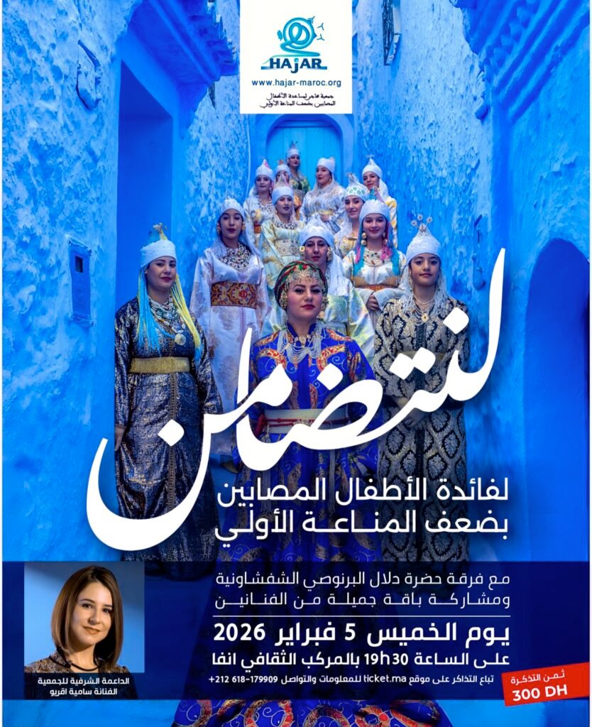 تحت شعار التضامن والإدماج، تسلط هذه الأمسية الموسيقية الضوء على التراث الفني التقليدي، في خدمة الأطفال الذين يعانون من اضطرابات ضعف المناعة الأولي. وبهذه المناسبة، دعت الفنانة سامية أّقريو، عرابة جمعية هاجر “الجمهور الكريم للحضور بكثافة يوم 5 فبراير، دعما للأطفال المصابين باضطرابات ضعف المناعة الأولي والاستمتاع في الآن ذاته بأمسية موسيقية روحانية لا تنسى”.