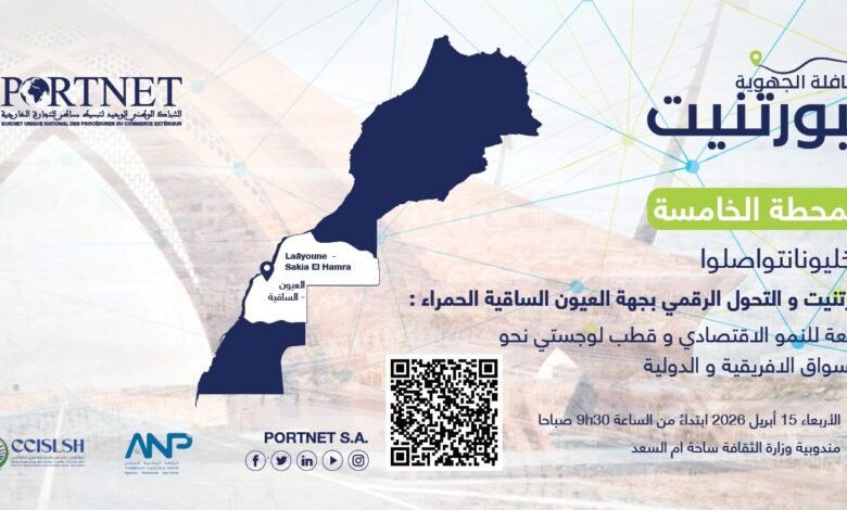 تستضيف جهة العيون-الساقية الحمراء المحطة الخامسة من قافلة اللقاءات الجهوية للتجارة الخارجية، يومه 15 أبريل 2026ومن تنظيم شركة بورتنيت، الشباك الوطني الوحيد لإجراءات التجارة الخارجية، بشراكة مع غرفة التجارة والصناعة والخدمات لجهة العيون الساقية الحمراء والوكالة الوطنية للموانئ، بمقر مندوبية وزارة الثقافة بساحة أم السعد في قلب مدينة العيون، حيث يجمع عددا من الفاعلين الاقتصاديين والمؤسساتيين وممثلي القطاعات المرتبطة بالتجارة الخارجية، وذلك في سياق يشهد تصاعد مكانة الأقاليم الجنوبية كمحور اقتصادي استراتيجي.